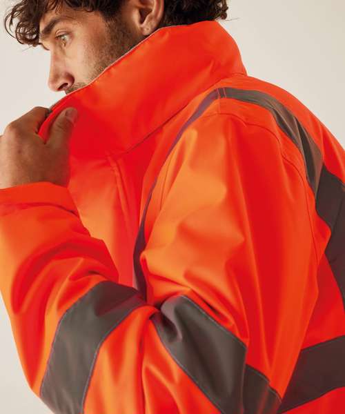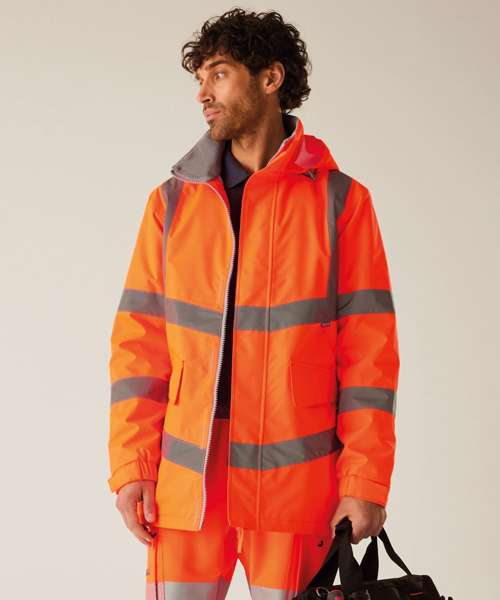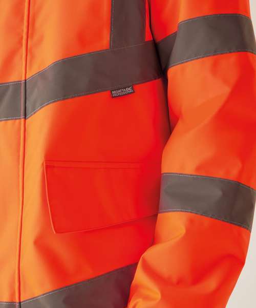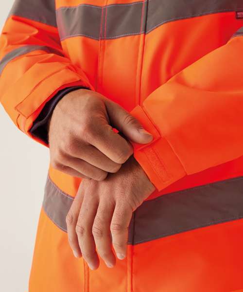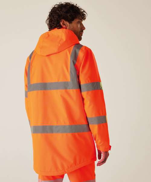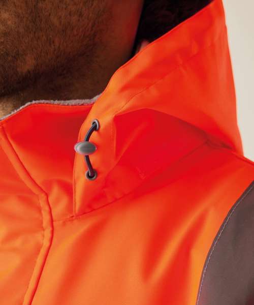 Waterproof Hydrafort 100% Polyester Oxford 300DD fabric. Medium-weight Thermoguard insulation, 100gsm. Certified to EN ISO 20471:2013 A1:2016 Class 3. Orange colourway is also certified to RIS-3279-TOM. Conforms to EN343:2019 Class 3:1. Two lower pockets. Internal pocket. Pack-away hood with adjusters. Adjustable cuffs with hook-and-loop fastening.
