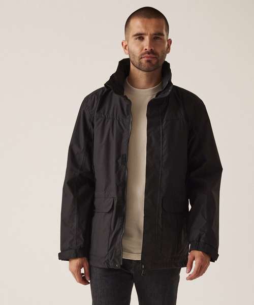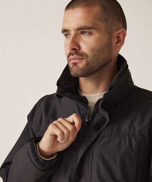 Waterproof and breathable Isotex 5000 coated polyester twill microfiber. Part mesh part polyester taffeta lined. Taped seams. Interactive Concealed hood with adjuster. Studded double stormflap. Adjustable cuffs. Internal map pocket. 2 zipped chest pockets. 2 lower patch pockets with side hand warmer entry. Internal mobile phone pocket. Adjustable shock cord waist and hem system. Internal zipped embroidery access.