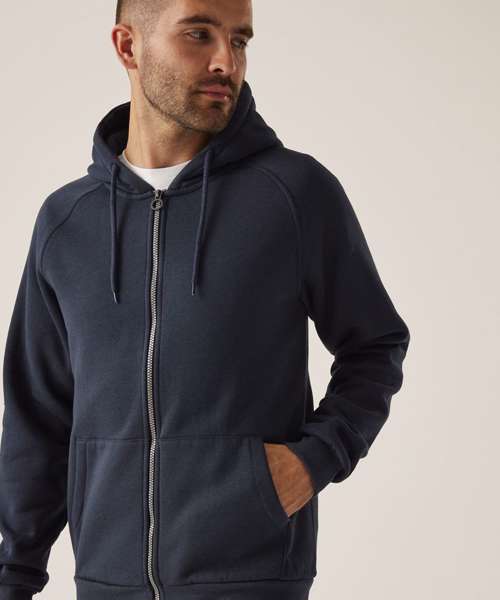 35% sustainable cotton and 65% polyester brushed back fabric. Centre front zip. Ribbed cuffs and hem.