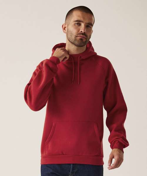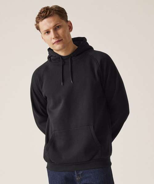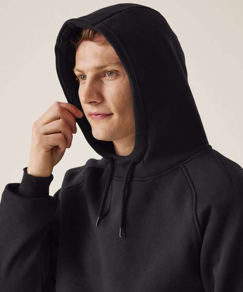 35% sustainable cotton and 65% polyester brushed back fabric. Grown-on hood with drawcords. Ribbed cuffs and hem.