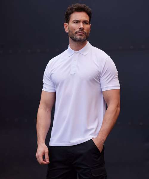 Standard fit. Permanent wicking finish. Antibacterial finish. Recycled polyester. Ribbed collar and cuffs. Twin-needle stitching details. Three-button placket with one spare button.