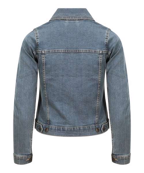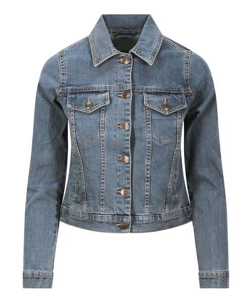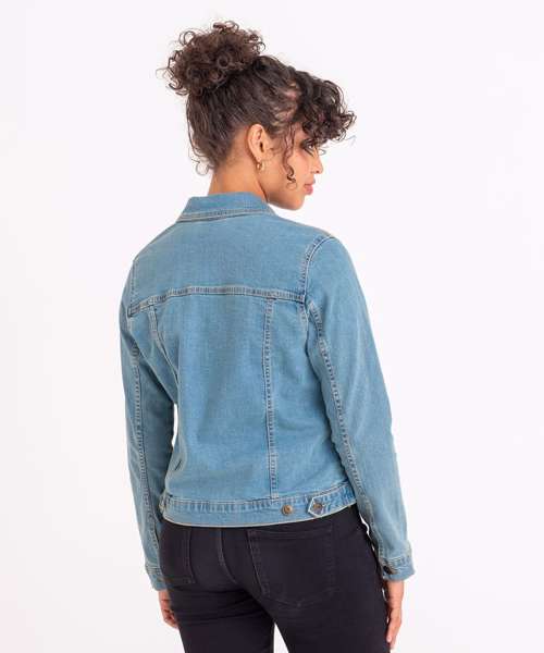 Cotton/elastane blended denim jacket with classic denim styling. 4 pocket design, shank button placket, button cuffs and adjustable back. Specific feminine fit with crop design. Contemporary female fit. Fashion fit. Stretch denim. 4 pocket styling. Classic light and dark blue washes. Contrast stitching. Classic denim jacket panelling. Button cuff detail. Inside back neck hanger loop.