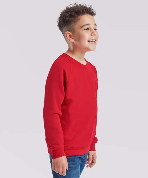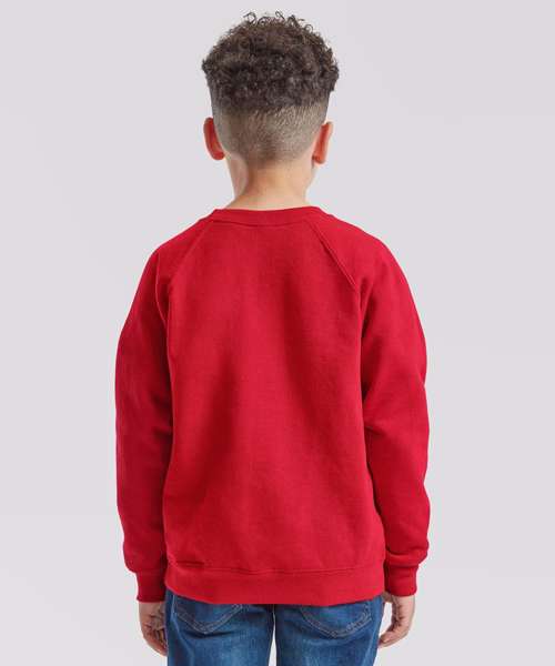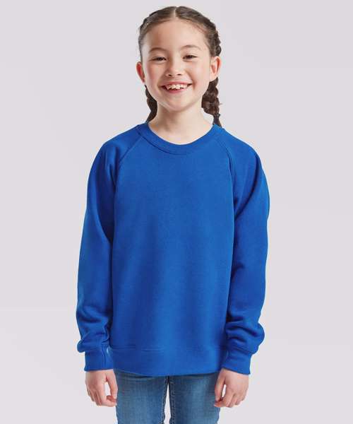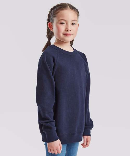 The kids classic raglan sweat is ideal for any kind of occasion, with a 100% cotton face ensuring perfect printing and embroidery results and a range of colours to choose from – all of which complement Fruit’s classic raglan sweat for adults, so you can make it yours to match. Single Jersey back neck tape and cotton/Lycra® neck, waist and cuff ribs provide everyday comfort.