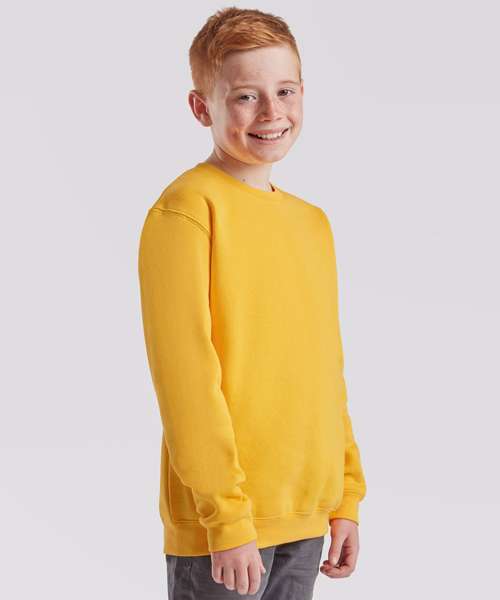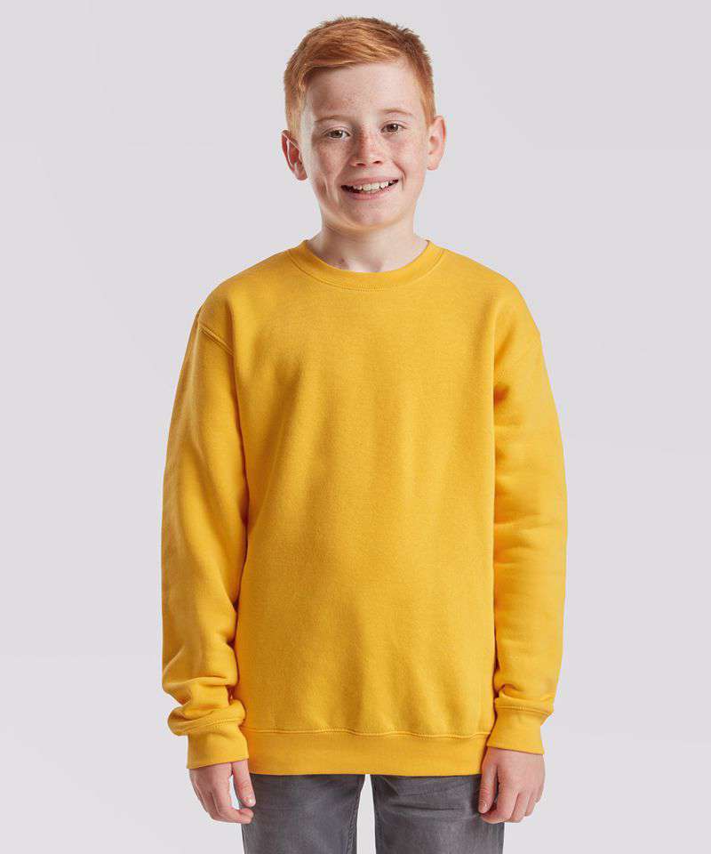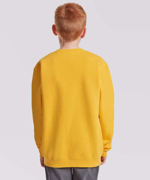With a 100% cotton face ensuring perfect printing and embroidery results and a wide range of colours to choose from, the kids premium set-in sweat is suitable for all kind of occasions. This super-soft garment features an inner brushed fleece and single Jersey back neck tape for comfort, while the cotton/elastane neck, waist and cuff ribs provide added comfort.