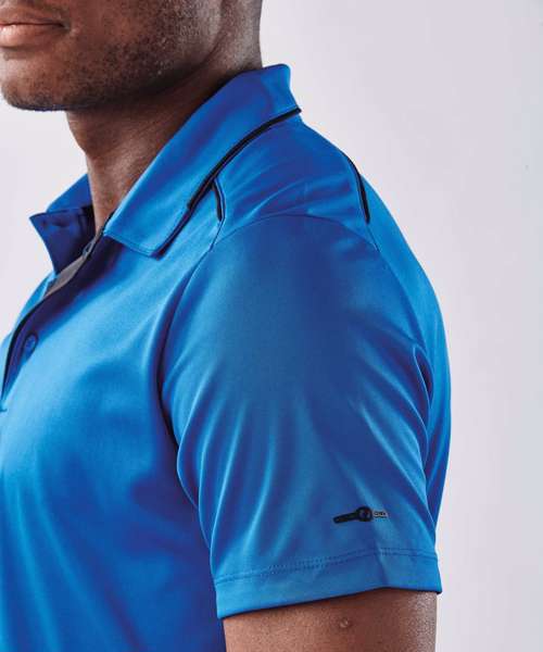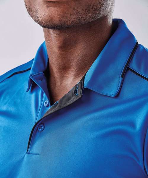 Mositure wicking polo shirt, features a durable self fabric collar, with high contrast trim at the collar and shoulders.