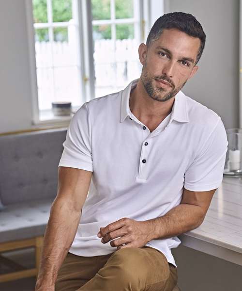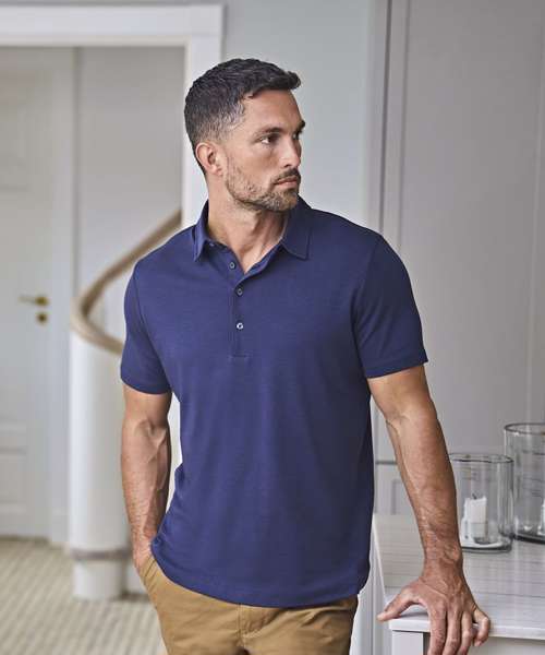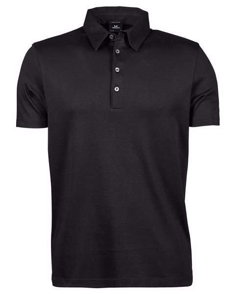 A stylish, state-of-the-art interlock polo shirt in 44 singles 100% Pima cotton, featuring a slim-fitted body. It has a self-fabric, stand-up collar, finished with an elegant placket with anthracite pearl imitation buttons.
