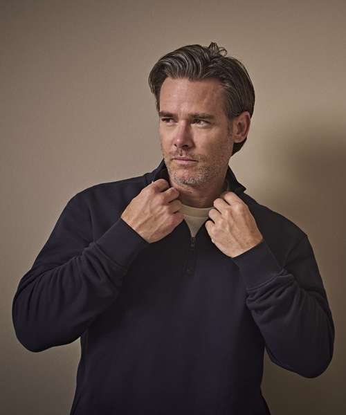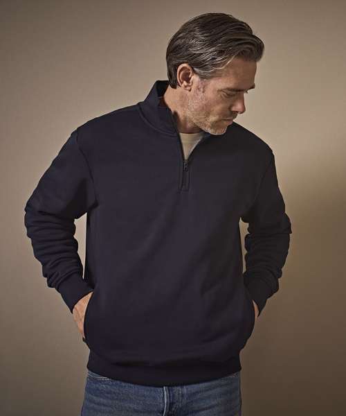 The classic Half-zip sweatshirt features double-stitched elastic cuffs, a ribbed raised collar and a waistband, with open side-seam pockets.