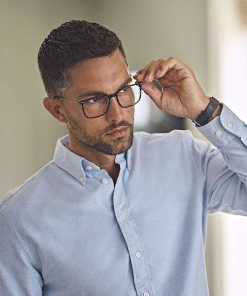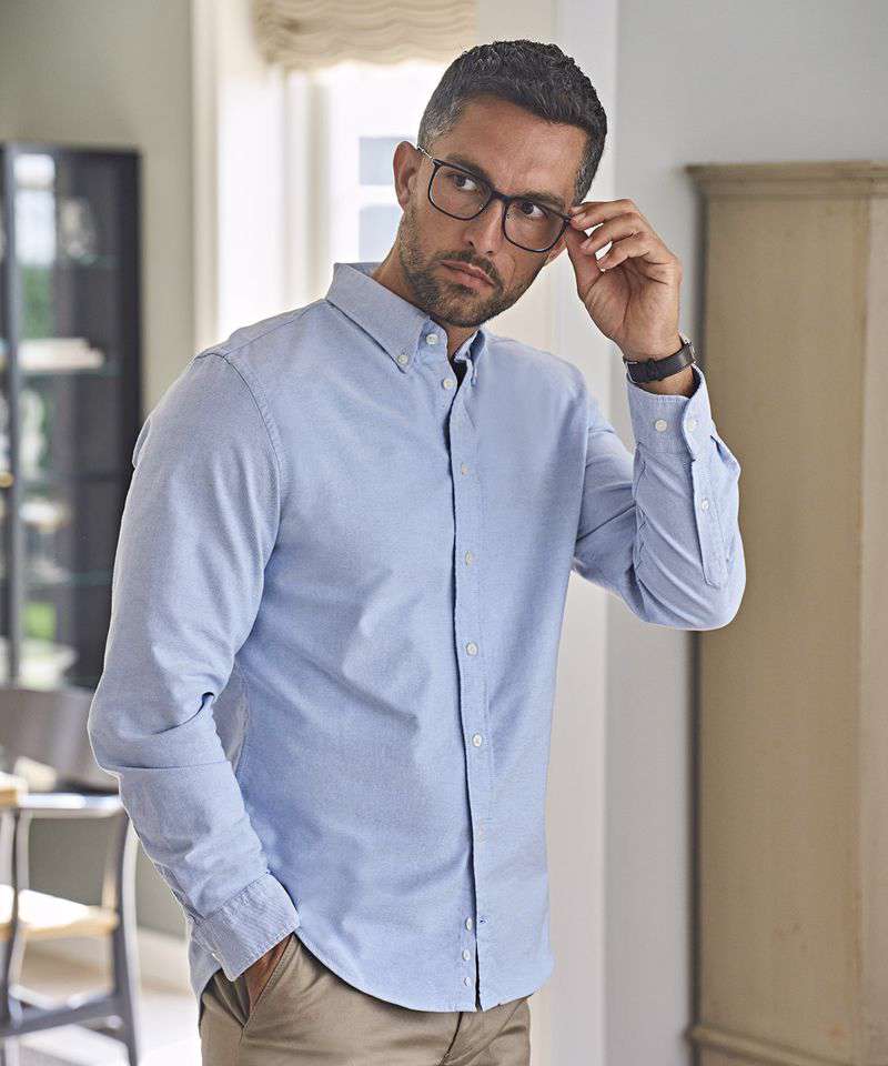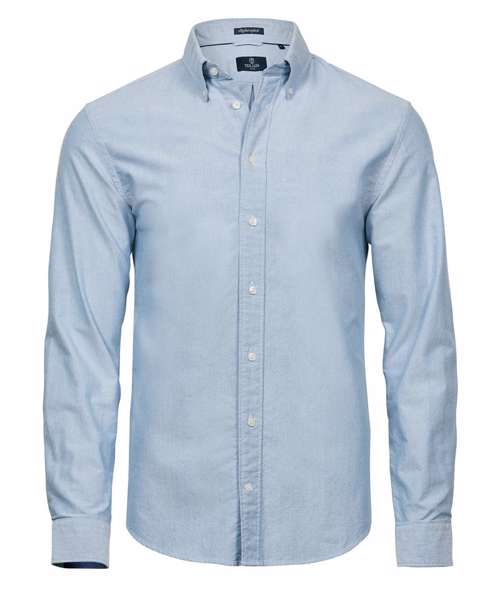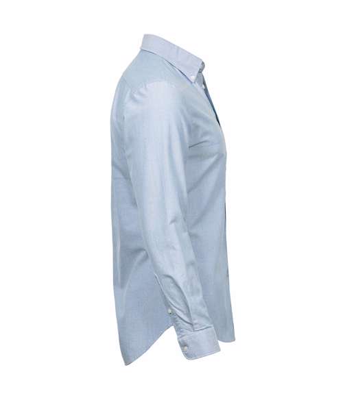 Shaped fit. Button-down collar. Fused collar and cuffs. Back yoke with box pleat. Inside hanger loop. Curved hem. Stretch fabric. Ascolite button wrapping.
